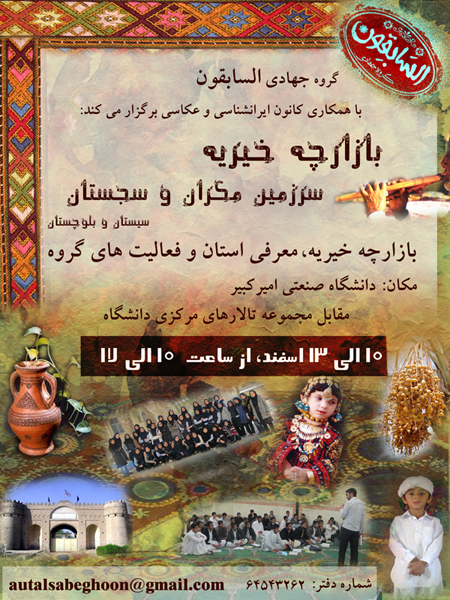 بازارچه خیریه ای در اسفند 92 در دانشگاه امیرکبیر برگزار شد. بازراچه شامل چهار غرفه جهت فروش کالاهای مختلف از استان سیستان و بلوچستان و دو غرفه جهت معرفی گروه و معرفی این استان تشکیل گردید. مدت زمان اجرای برنامه چهار روز بوده است. موسیقی زنده بلوچی نیز در وسط بازارچه اجرا گردید. هدف اصلی این بازارچه آشنایی هر چه بیشتر افراد با این استان و کارهای گروه ما در این استان بوده است. به همین دلیل سعی شد که از هر لحاظی کامل باشد (فروش غذاهای استان، پوشاک، صنایع دستی و همچنین موسیقی این استان). به دلیل اولین تجربه ما، کار با ضعف و قوت هایی و همچنین مشکلاتی از جمله فراهم کردن همه اجناس از آن استان و انتقال آنها به تهران صورت پذیرفت.
